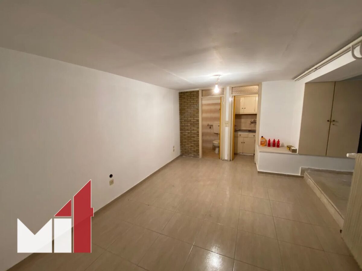 The bright property requires renovation, offers an open-concept layout and features a living room with an open plan kitchen, a bedroom and a bathroom.
