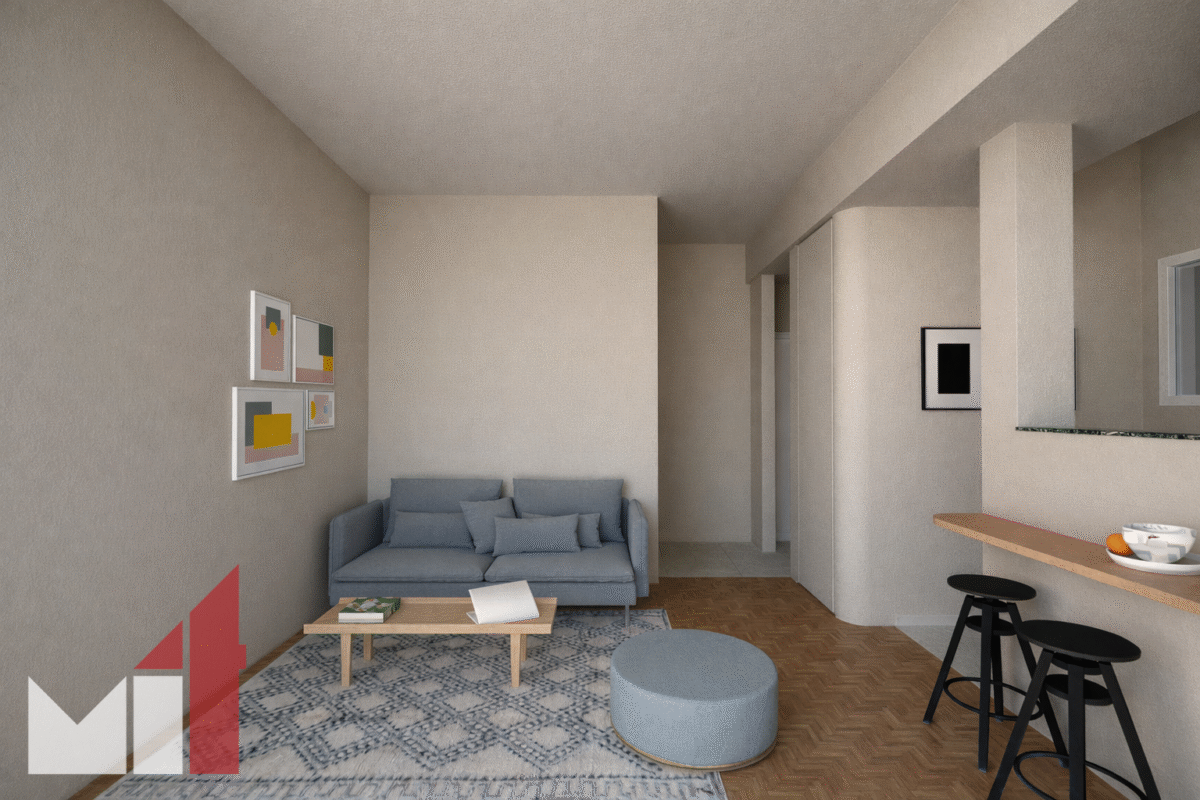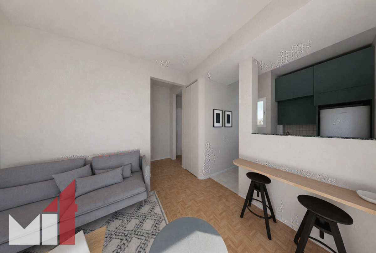 The apartment is fully renovation and consists of a living room, a separate kitchen, a bedroom and a bathroom.