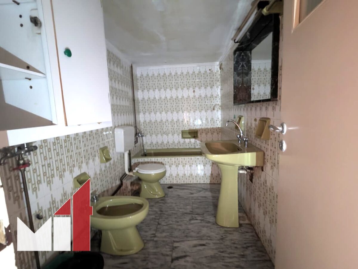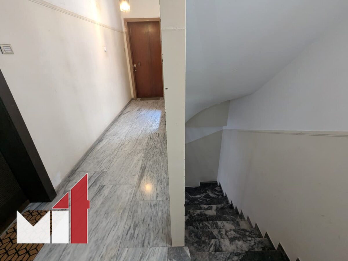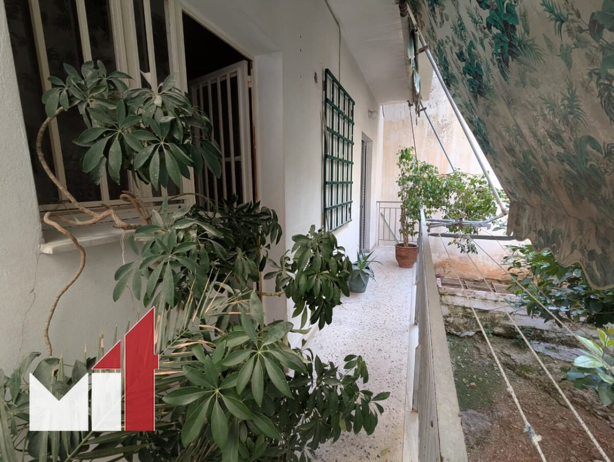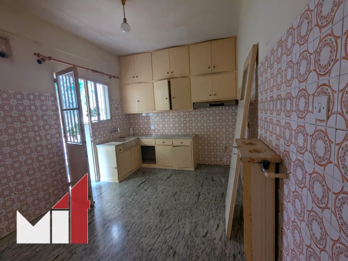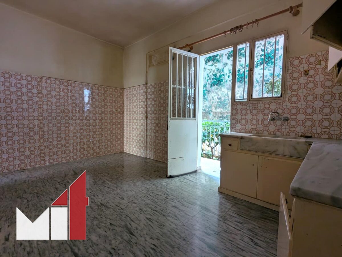 The dual-aspect property requires renovation and consists of a very spacious front-facing living room with marble floors, a separate kitchen, two bedrooms with access to balconies and one bathroom with a storage loft on top.