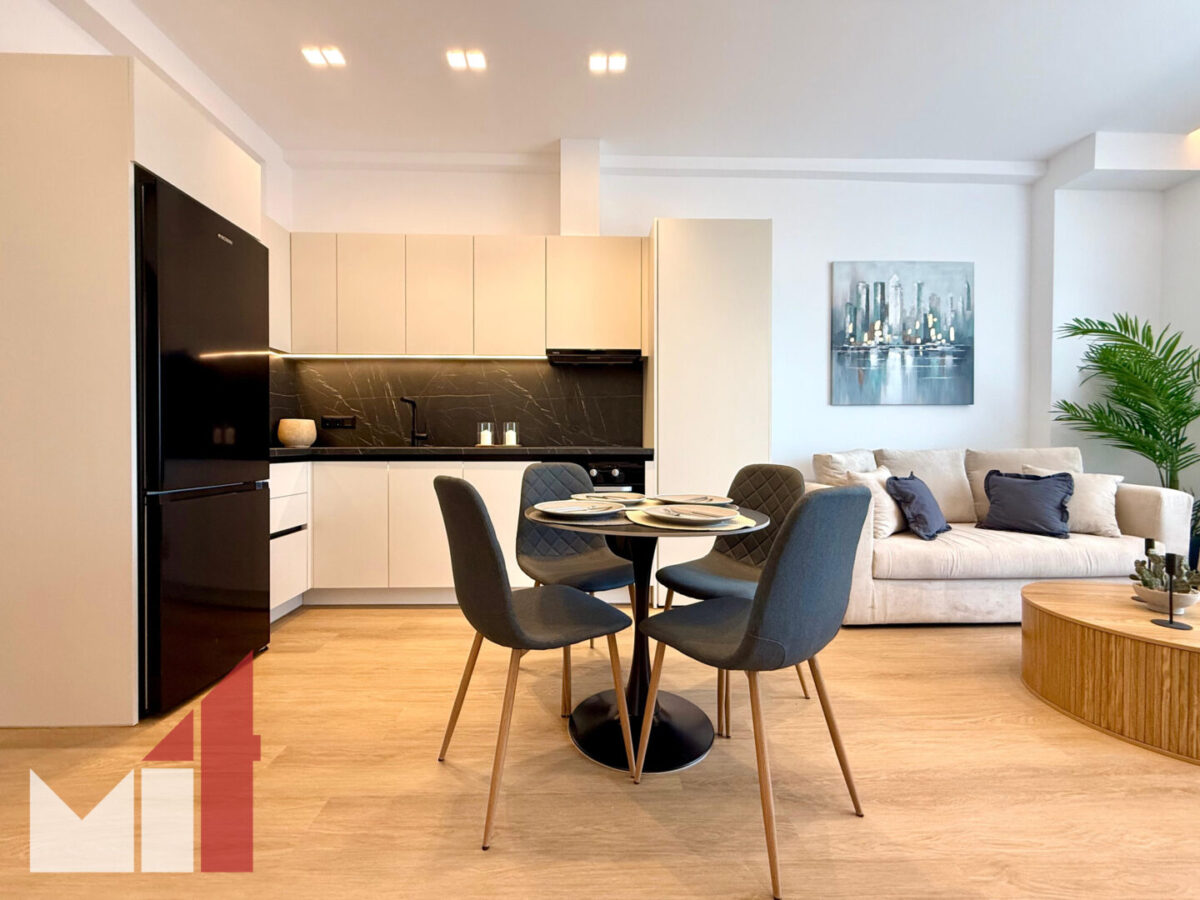 The luxurious property features an open concept layout and consists of a modern living room with an open plan kitchen, two bedrooms with walled-in closets and two bathrooms.
