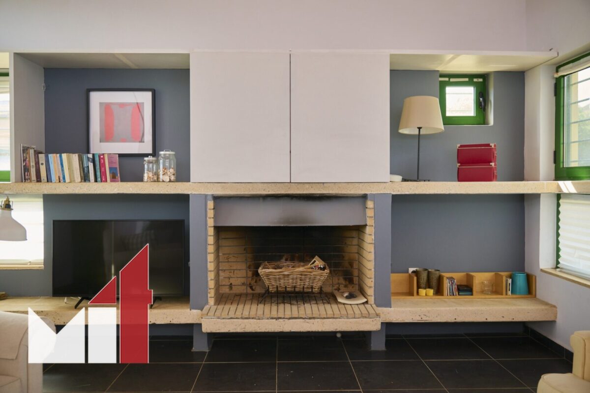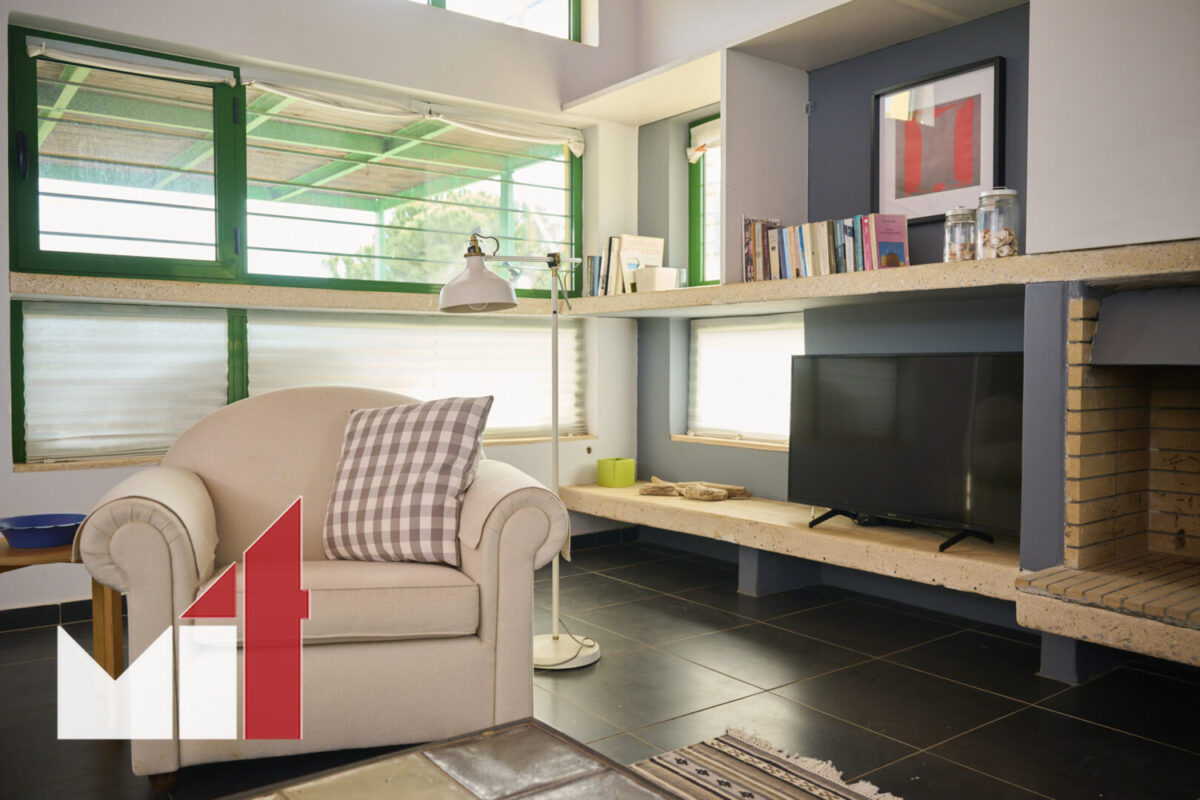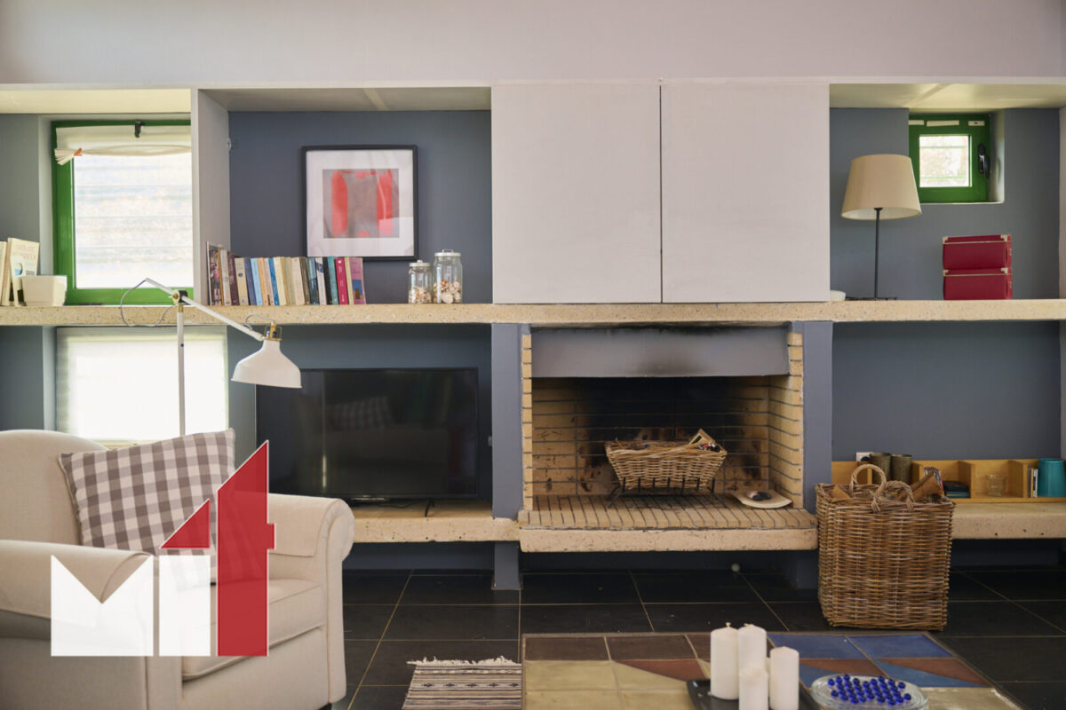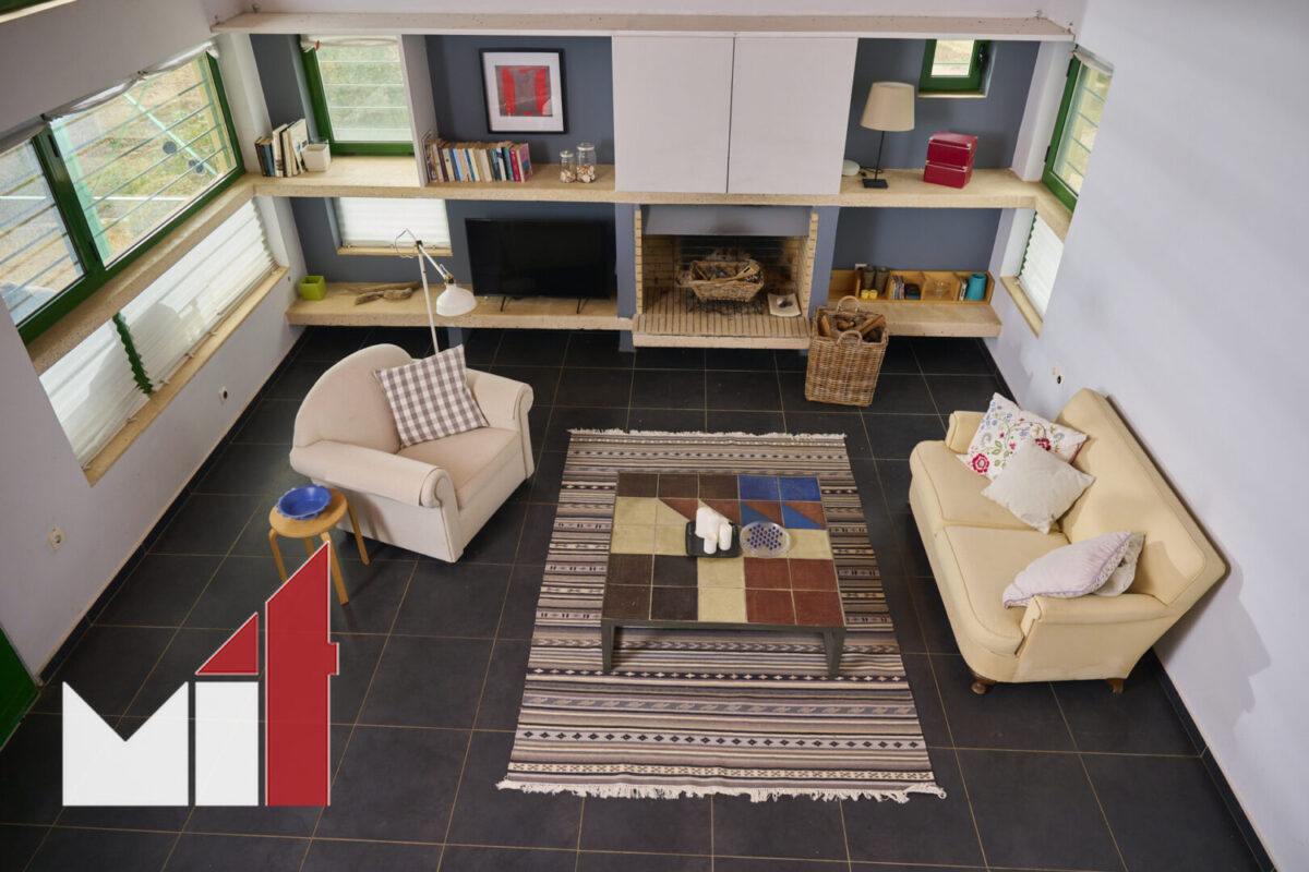 It consists of three floors: The ground floor includes the entrance, an open-plan kitchen, a dining area, a living room with a fireplace and direct access to the terrace & garden. The first floor includes one bedroom, one bathroom, a small area that is used as a study, which overlooks the living room, and a large balcony. Finally, the lower ground floor consists of two bedrooms, two storage units, one bathroom and access to the garden.