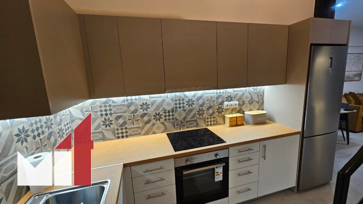 The well-designed apartment consists of a living room with an open plan kitchen, a bedroom and a bathroom.