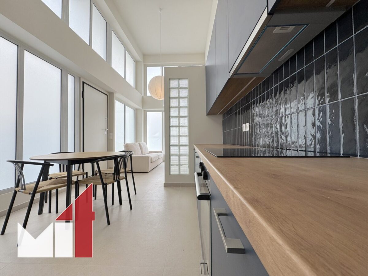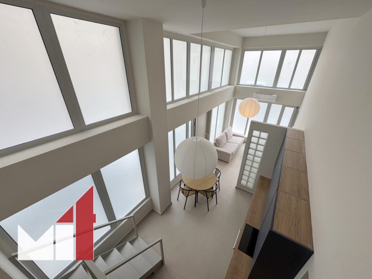 The mezzanine on the first floor accommodates one more bedroom and one more bathroom with a total surface of 28 m2 with multiple transparent windows offering natural light.
