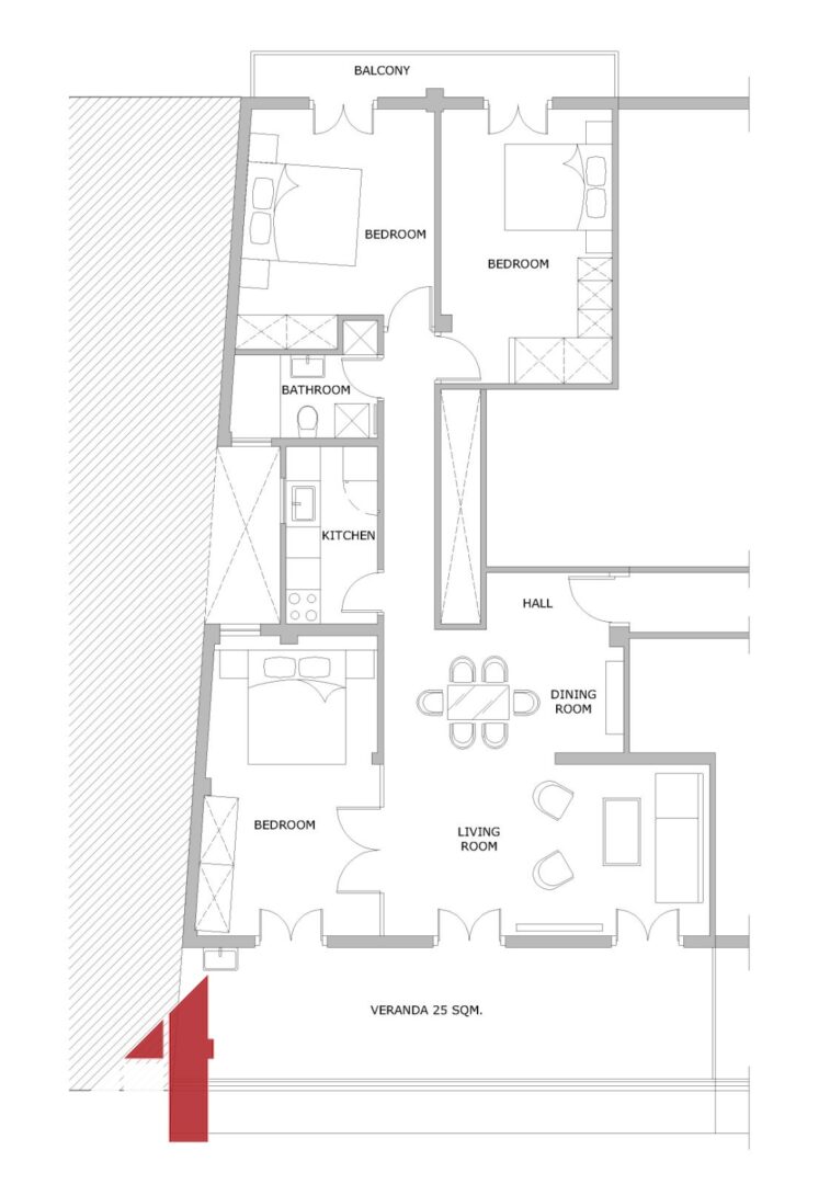 The luxurious and commodious dual-aspect property features plenty of sunlight due to many transparent glass-doors and consists of a welcome hall with an open plan living room, a separate kitchen, three bedrooms and one bathroom with an attic on top.